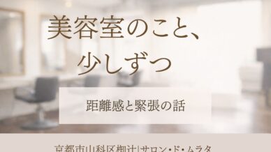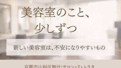 美容室のこと、少しずつ(連載) 新しい美容室を探すとき、不安になるのは普通のことです 新しい美容室を探すとき、不安を感じるのは自然なことです。初めてのお店の雰囲気や、どんな人が担当するのか気になる方へ。山科区椥辻の美容室から、よくある迷いについてお伝えします。 2026.02.10 美容室のこと、少しずつ(連載)
